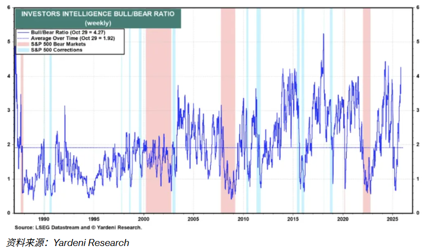 从一项指标来看,投资者当前的看涨情绪达到一年来最高。亚德尼研究公司的分析显示,在投资者情报(Investors Intelligence)对通讯作者进行的截至10月29日当周的调查中,看涨者与看跌者的比例升至4.27——突破了4.00这一历史上标志情绪过度狂热的阈值。另一项显示乐观情绪升温的信号来自美国个人投资者协会(AAII)的周度散户调查:过去7周中,看涨情绪有5次超过37.5%的历史均值。