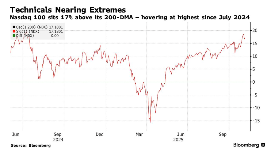 亚德尼表示,在标普500指数实现约17万亿美元的反弹后,关键市场技术指标正接近历史极值:标普500指数较200日均线高出至多13%,如此大的偏离度传统上意味着涨势已过度延伸。纳斯达克100指数(NDX)较长期支撑位高出17%,接近2024年7月以来的最大偏离度——在去年7月之后,8月日元套利交易引发市场动荡,股市随即出现抛售。